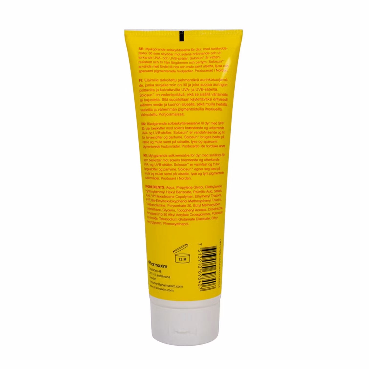 Solosun används med fördel till nos och mule samt andra utsatta ljusa och sparsamt pigmenterade hudpartier.