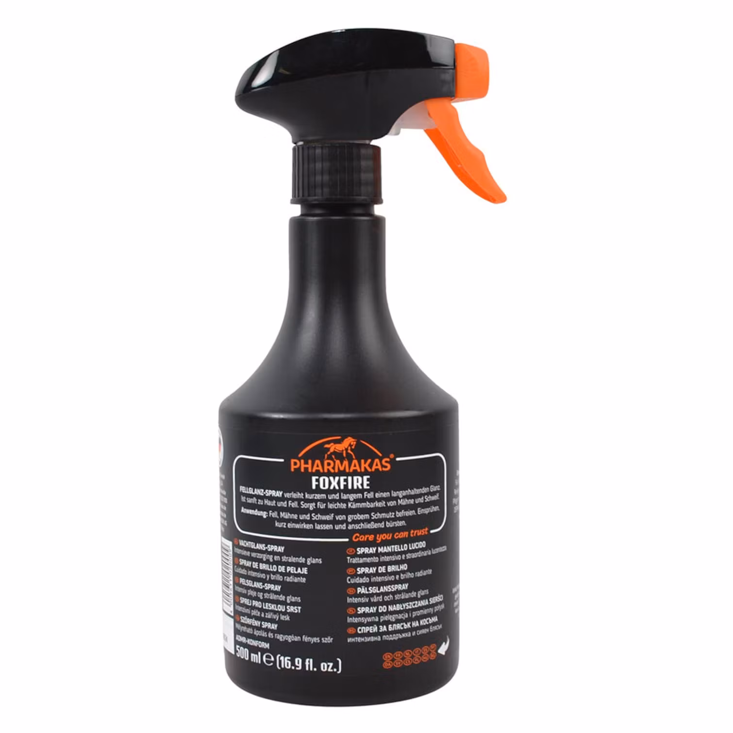 Foxfire päls-, man- och svansglans. Innehåller provitamin-D pantenol som ger päls och tagel en ihållande fuktighet, ger glans samt en lättutredd svans. Ämnet hämmar också infektioner och klåda. UV-skydd.Levereras med sprayhuvud.Nu med organisk argan olja, biotin och keratin.
